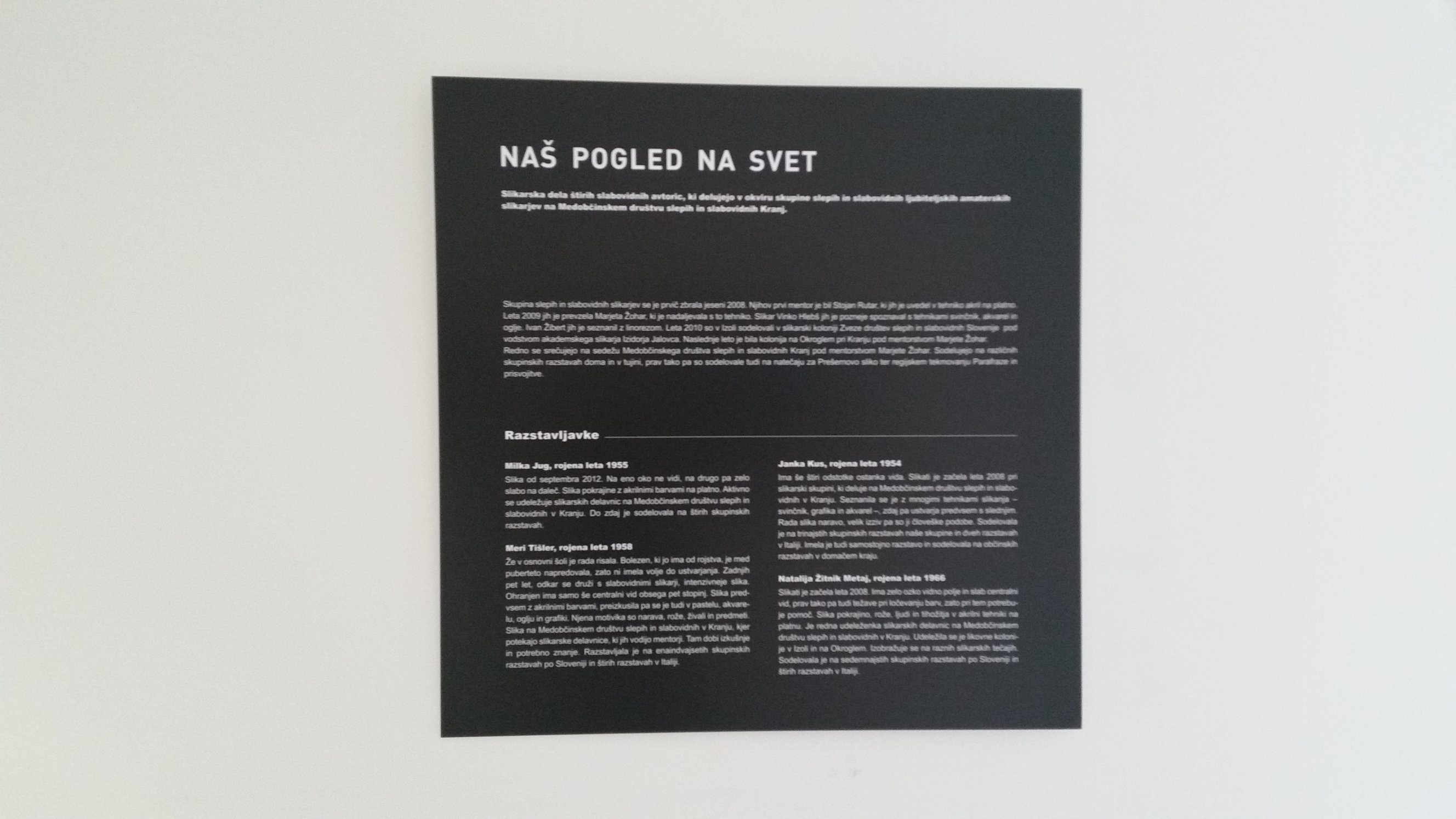 V času simpozija je v galerijskem prostoru knjižnice zaživela tudi nova razstava »Naš pogled na svet« slepih in slabovidnih slikark, ki delujemo pri MDSS Kranj. Razstavljamo Milka Jug, Natalija Žitnik Metaj, Meri Tišler in Janka Kus.